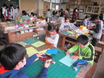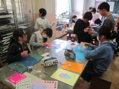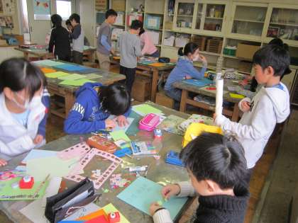 5年図画工作科「たてわり色紙表紙づくり」 たてわり班でお世話になった6年生渡す色紙の表紙づくりをしていました。心を込めて作っていました。