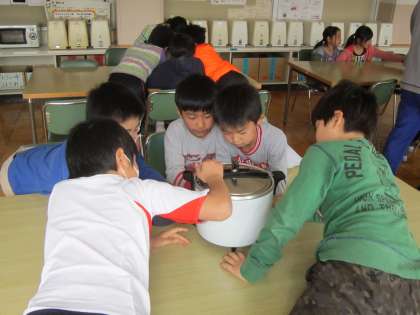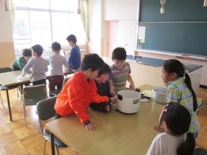 3年社会科「くらしのうつりかわり」 昔の生活用品の名前や使い方を学習しました。家庭科室にあった古い炊飯器を手に取って観察していました。