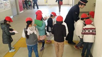 北野駅まで行き、長沼駅までの切符を自分で買い、電車に乗る体験をしました。長沼駅では、駅員さんに、お客さんが使いやすい駅にするための工夫を聞いたり駅員室の様子を見たりしました。しっかりメモをとりながら見学することができました。
