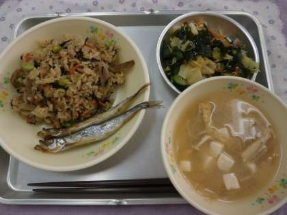具だくさんのごはんに、わかめやちりめんじゃこ、野菜と