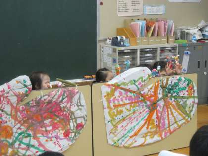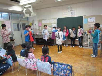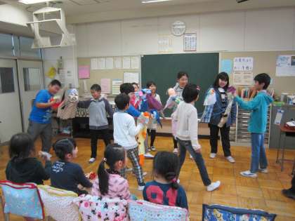 ひまわり学級図画工作科「子ども人形劇」 図画工作科で作ったお面と指人形を使って、「おにのくびひき」と「手ぶくろ」の人形劇をしました。楽しい劇の発表ができました。