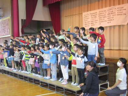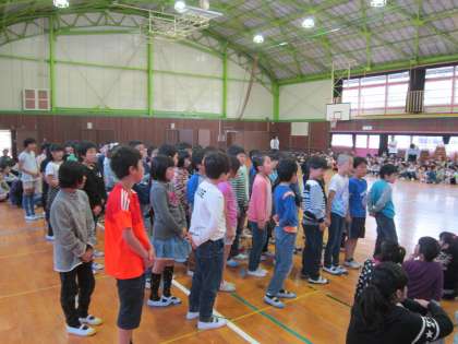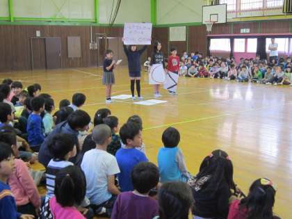 1時間目は、1年生を迎える会でした。1年生全員と全校児童が初めて対面しました。上学年の子供たちのおもてなしに1年生が嬉しそうにしていました。最後は、5・6年生の背中にのって退場しました。