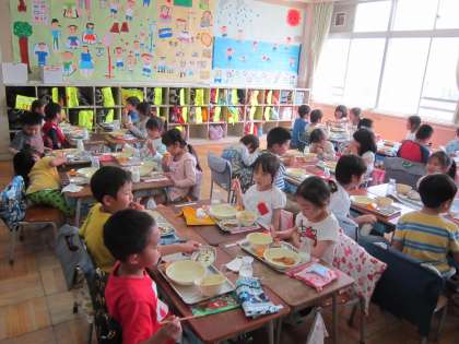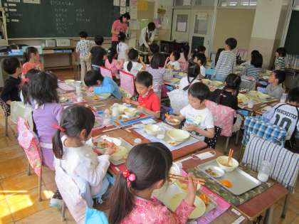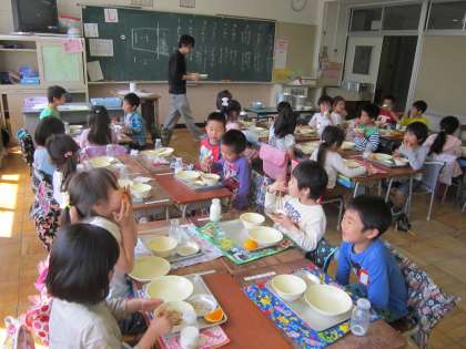 1年生も給食に大分慣れてきました。今日の給食「八王子ラーメン」を美味しくいただきました。
