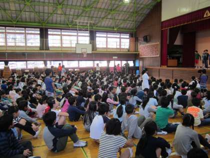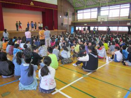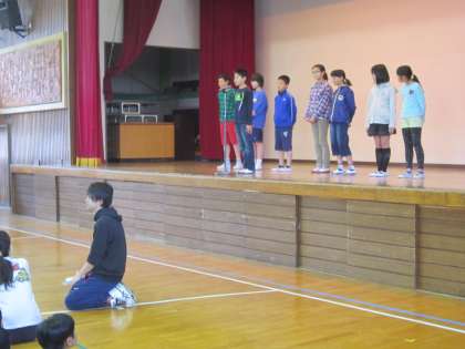 委員会紹介の集会をしました。各委員長が仕事内容やお願いを発表して、委員全員の紹介がありました。