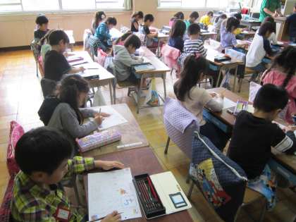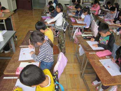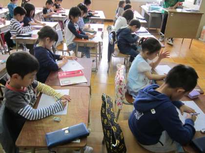 1年国語科「ひらがな」 ひらがな「ち」の学習をしました。書き順や使い方など、丁寧に練習していました。