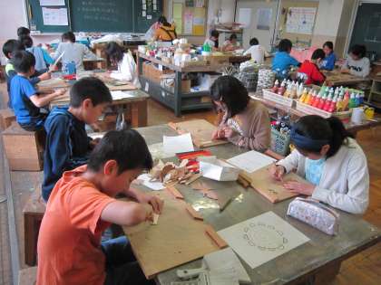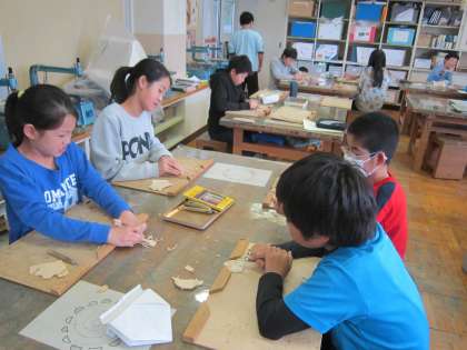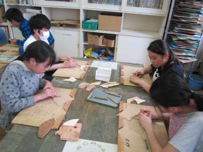 6年図画工作科「線から生まれた形」 彫りすすみ版画の学習をはじめます。今日は、木切れを使って、彫刻刀の練習をしました。