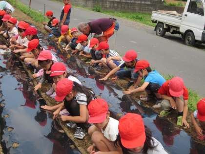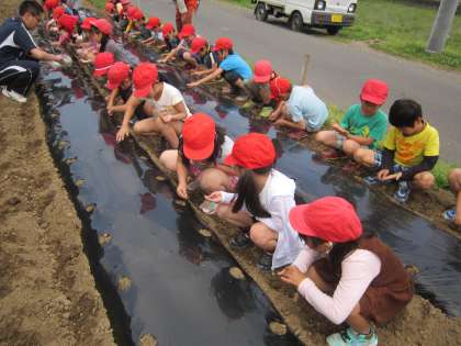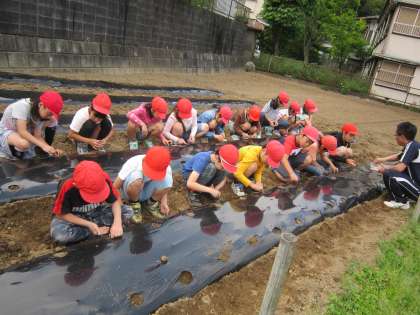 3年総合的な学習の時間「大豆を育てよう」 今年も地域の方の畑を借りて、指導を受けながら大豆(枝豆)づくりをはじめました。今日は、マルチがかかった畑に豆まきをしました。