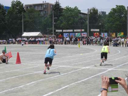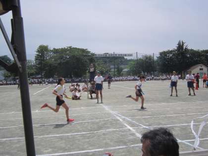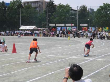 打越中学校の運動会に招かれて、6年生の代表がリレー競技に参加しました。由井第一小学校とよい交流活動となりました。