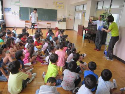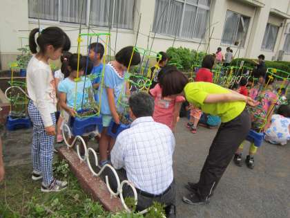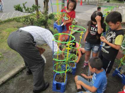 2年生活科「大きくなれ わたしのやさい」 地域の方からミニトマト、なす、きゅうり、とうもろこしのお話を聞いてから、ミニトマトの栽培の指導を受けました。