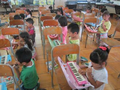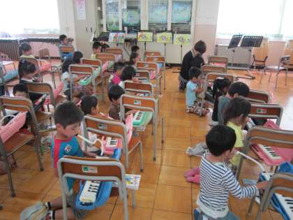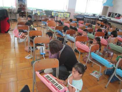 1年音楽科「さいたさいた」 鍵盤ハーモニカでドレミの指づかいとタンギングの練習をしました。