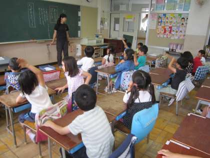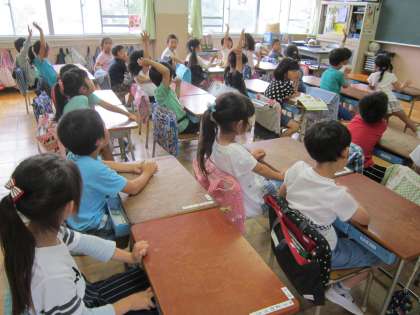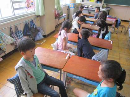 1年国語科「わけをはなそう」 私は(ぼくは)、・・・です。なぜかというと・・・からです。二人で対話するスキルの学習をしていました。