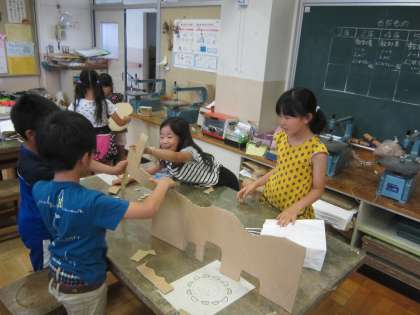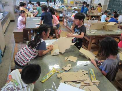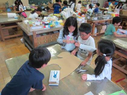 3年図画工作科「だんだん変身ダンボール」 切った段ボールの形を想像して、グループで組み合わせや組み方を工夫しながら活動していました。