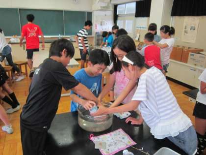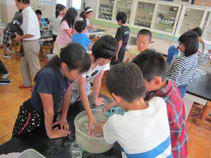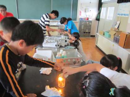 6年理科「ものが燃えるとき」 予想をしてから、水上置換をして酸素を集め、燃焼実験していました。燃え方の違いをじっくり観察しました。