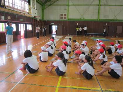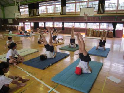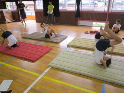 5年体育科「器械運動」 今日は、教育実習生の研究授業でした。マット運動の連続技を、グループで教え合いながら学習しました。