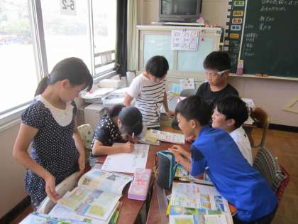 5年社会科「私たちの国土」 梅雨・台風・季節風にいて、グループで調べたことを発表し、日本各地の雨温図をみて、その特徴について話し合っていました。