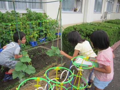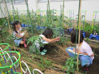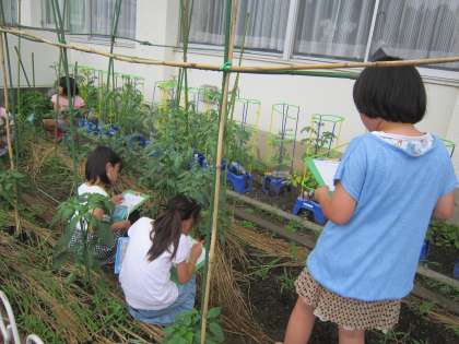 2年生活科「大きくなあれ わたしのやさい」 大きくなってきたミニトマト、なす、とうもろこしなど、じっくり観察していました。