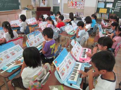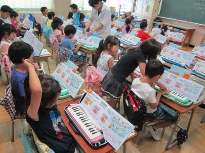 1年音楽科「かえるのがっしょう」 鍵盤ハーモニカの練習をしていました。指づかいができるようになったお友達がミニ先生になって教え合いをしていました。