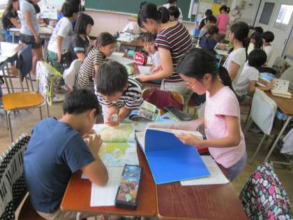 5年総合的な学習の時間「姫木平を調べよう」 学校図書館活用授業です。中央図書館と学校図書室の本を活用して、テーマごとの調べ学習をはじめました。