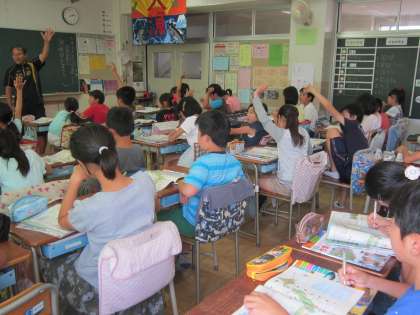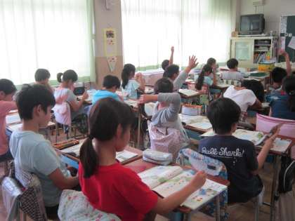 5年社会科「私たちの生活と食料生産」 資料を見ながら、日本の米作り、野菜、果物、畜産のさかんな地域について考察して、話し合っていました。