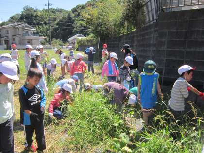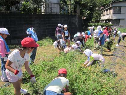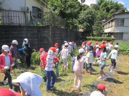 3年総合的な学習の時間「大豆を作ろう」 枝豆を夏休み中に収穫し、残った豆を収穫して、乾かして大豆にしていきます。豆腐作りまで計画しています。暑い中頑張って、畑に感謝しながら草取りまでしました。