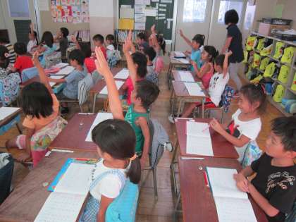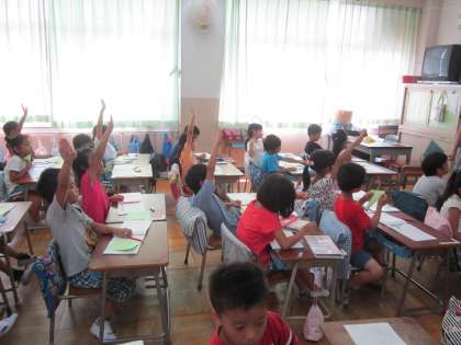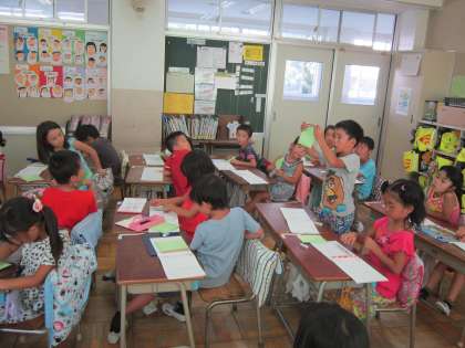 1年算数科「どちらがながい」 今日は、四角い紙の縦と横の長さをくらべます。折ってみたり、鉛筆や消しゴムを使ったり、たくさんの比べ方を発見しました。