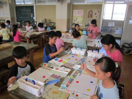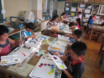 3年図画工作科「花束をどうぞ」 絵の具の赤青黄の3色だけを使って、いろいろな色を作り、カラフルな花束を描きました。