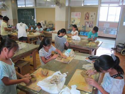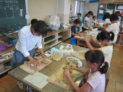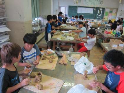 5年図画工作科「まほうのつぼ ドッキ土器」 粘土ををよくこねて、板づくり、ひもづくり、型を使ってなど、いろいろな技法で焼き物の形を作っています。