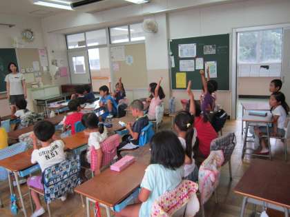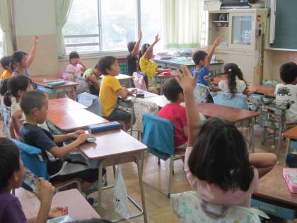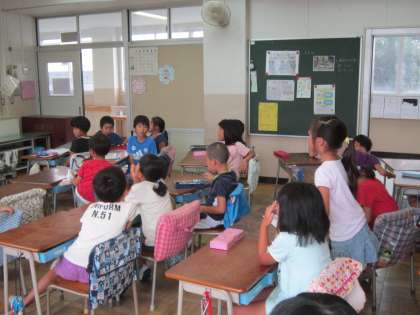 2年国語科「動物園のじゅうい」 お話の段落のはじめに出てくる言葉のカードを並べて、お話の中での言葉の順番について、理由もつけて話し合っていました。