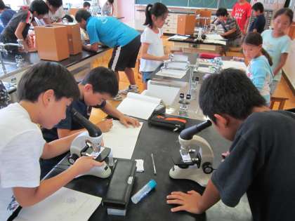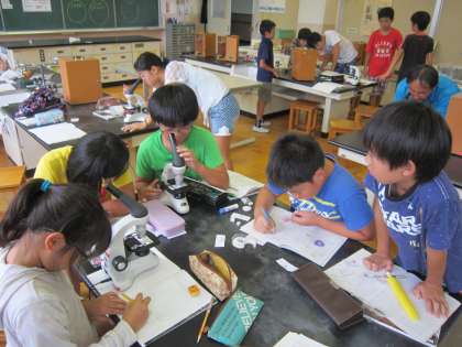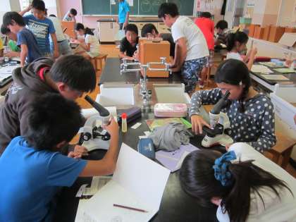 5年理科「花から実へ」 アサガオ、ヘチマ、ツルレイシのおしべの花粉を顕微鏡で観察しました。