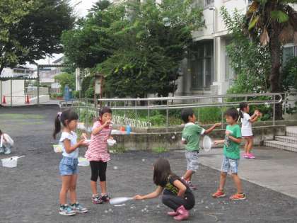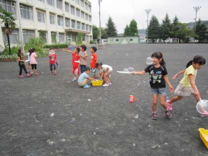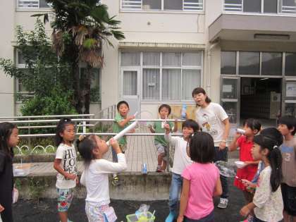 1年生活科「シャボン玉であそぼう」 自分で作った道具を使って、シャボン玉を作って楽しく遊びました。
