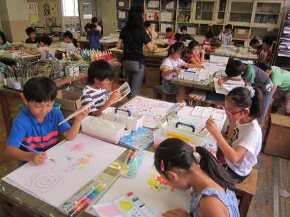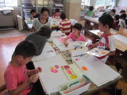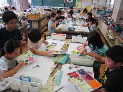 3年図画工作科「花束をどうぞ」 赤、青、黄、白の絵の具を使って、いろいろな色を作って、画用紙にステキな花束を描きました。
