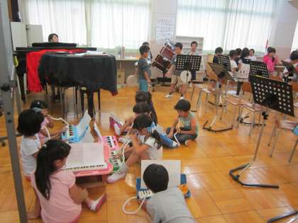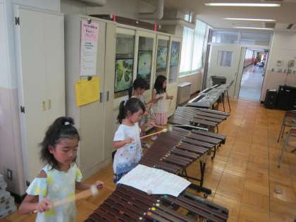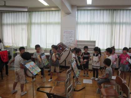 1年音楽科「夢をかなえて」 大好きなドラえもんの曲です。いろいろな楽器のパート練習をして、最後に合わせて演奏しました。