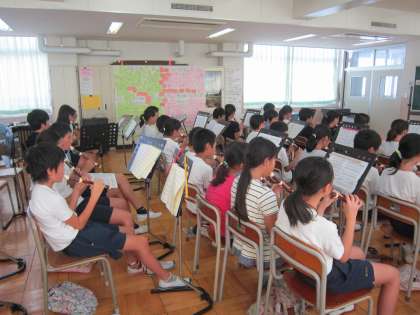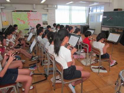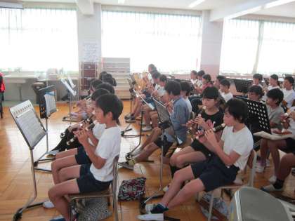 6年音楽科「カントリーロード」 曲の速さを変えて、リコーダーの練習をしていました。次にグループごとに卒業演奏会の内容を話し合いました。