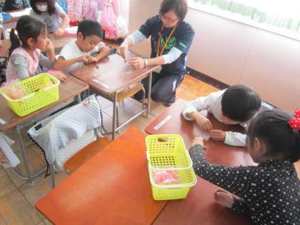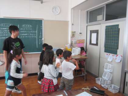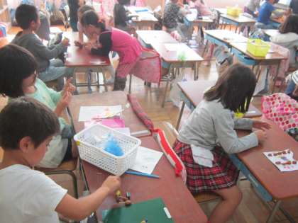 1年生活科「どんぐりであそぼう」 どんぐりゴマやまとあてを工夫しながら、作って、楽しく遊んでいました。