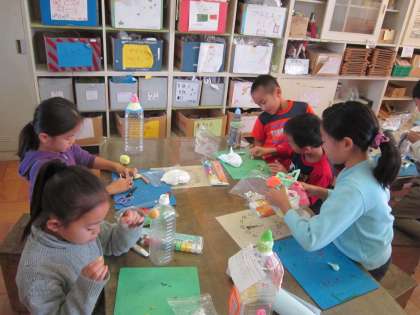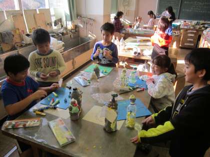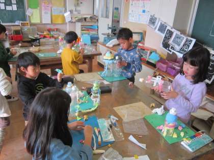 2年図画工作科「ゆめ いろ おしろ」 紙粘土に色を混ぜて、ペットボトルを土台にしてお城を作ります。カラフルに工夫して作っていました。