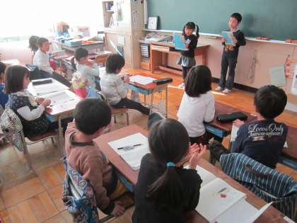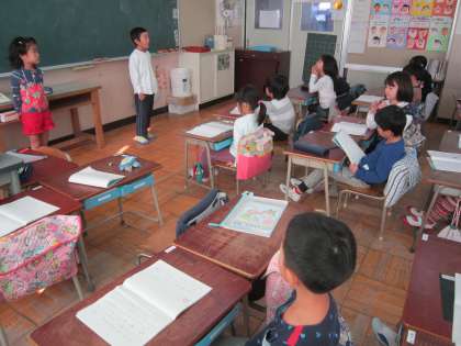 1年国語科「ともだちにきいてみよう」 好きな遊びは、食べ物は、おもちゃは・・・など、友達への質問を考えて聞き取ったことを、発表していました。
