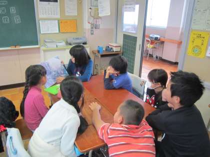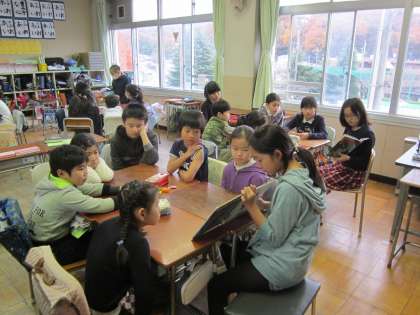 今朝は、6年生がたてわり班で読み聞かせをしました。下学年の子供たちは、6年生の読み聞かせに聴き入っていました。