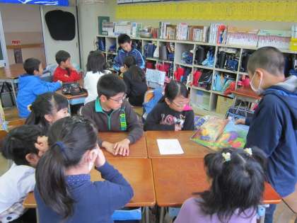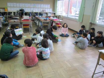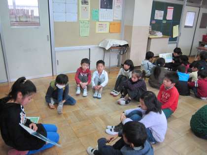 今朝は、6年生がたてわり班で読み聞かせをしました。下学年の子供たちは、6年生の読み聞かせに聴き入っていました。