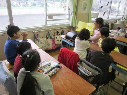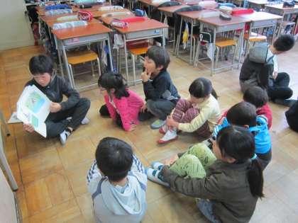 今朝は、6年生がたてわり班で読み聞かせをしました。下学年の子供たちは、6年生の読み聞かせに聴き入っていました。