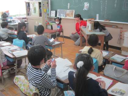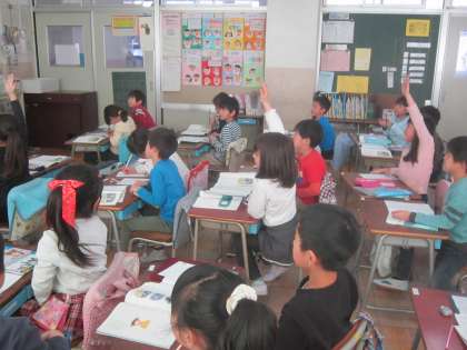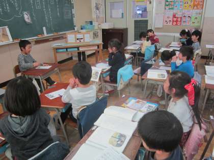 1年国語科「たぬきの糸車」 障子の穴から除くたぬき、糸車をまわすおかみさん、動作化しながら、登場人物の気持ちを表現する学習をしていました。