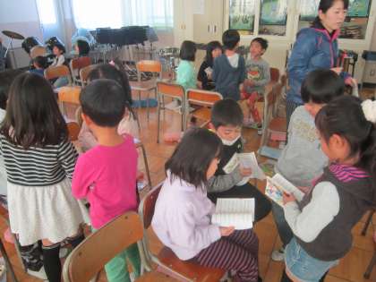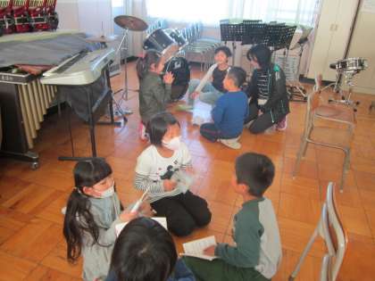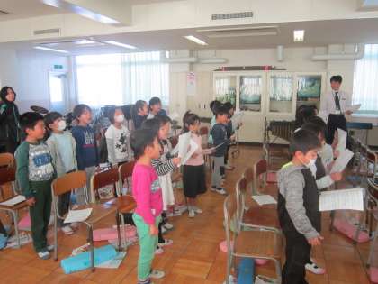 1年音楽科「気持ちを込めて歌おう」 グループごとにグループの名まえと課題曲を決めて練習して、発表会をします。楽しそうに相談していました。
