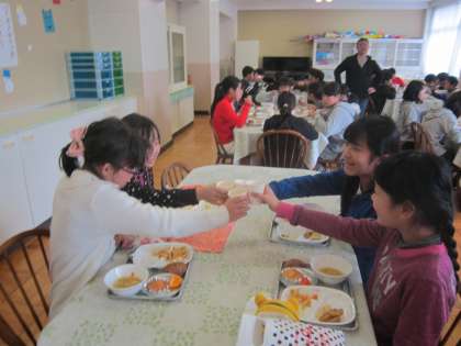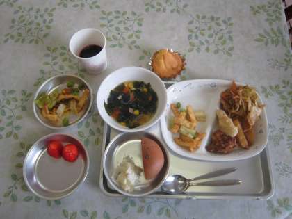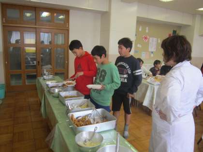 6年1組のバイキング給食でした。主菜、副菜、主食をバランスよくとって、小学校最後のランチルームでの食事を楽しみました。