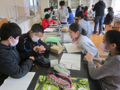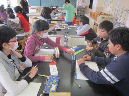 6年理科「発電と電気の利用」 発電装置を使って、豆電球とLED電球の明るさの違いや色の違いなどを調べていました。