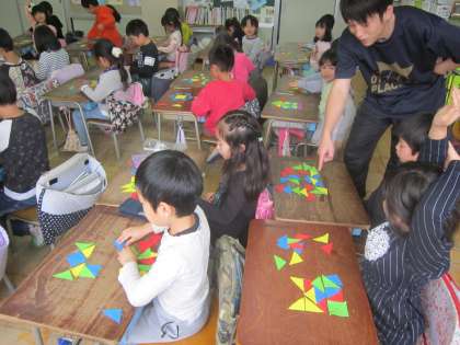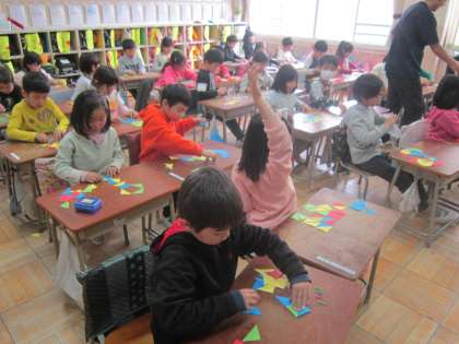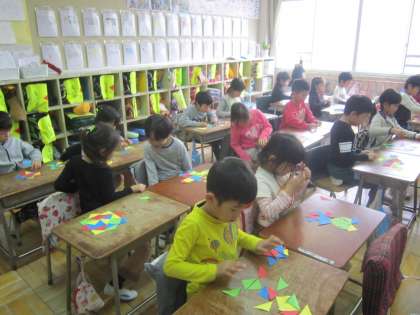 1年算数科「かたちづくり」 24枚の色板を並べて、いろいろな形を作ります。組み合わせを工夫しながら、一生懸命にかたちづくりをしていました。