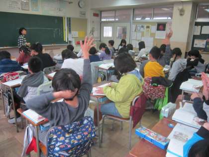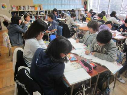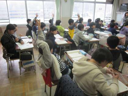 5年国語科「わらぐつの中の神様」 登場人物の人柄、ものに対する見方・考え方について一人一人考え、話し合いながら学習していました。