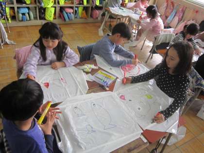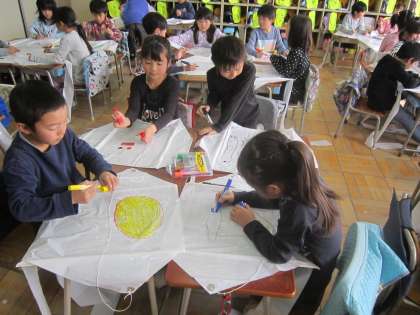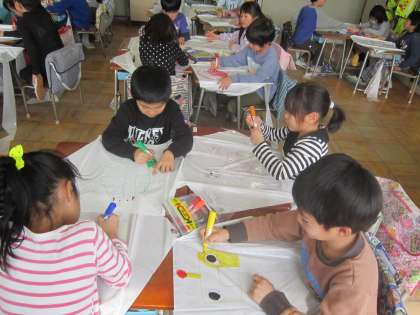 1年生活科「むかしあそび」 凧作りをしたり、作った凧であそんだり、活動を楽しんでいました。