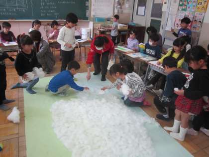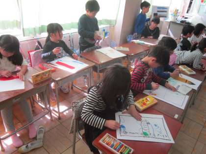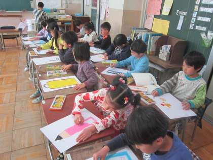 1年図画工作科「きょうしつをかざろう」 新一年生のために、大きなくじら雲や学用品などの絵を描いて、教室を飾る準備をしていました。