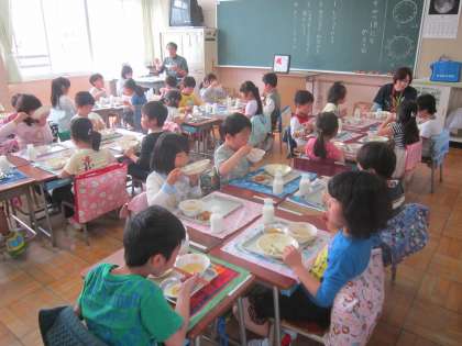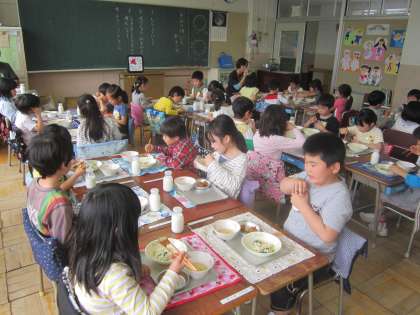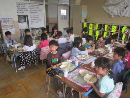 1年生の給食の様子です。配膳の仕方も上手になり、美味しそうに給食を食べていました。
