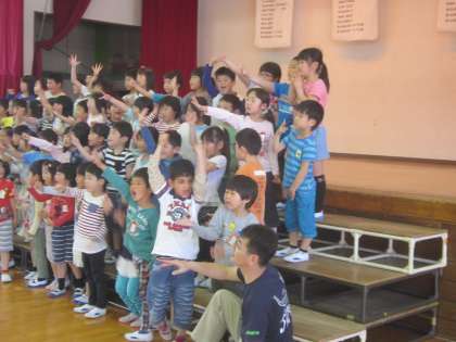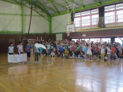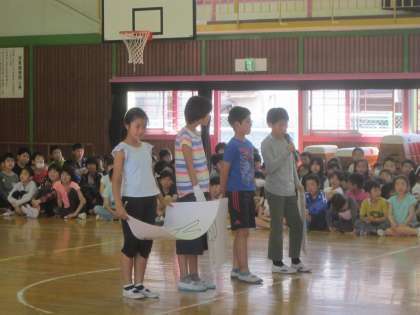 3時間目に全校で1年生を迎える会をしました。1年生が3年生と手をつないで入場しました。○×クイズ、ジャンケンゲーム、全校合唱、プレゼントなど、楽しい歓迎の行事になりました。最後は、5・6年生の作った馬に乗って笑顔で退場しました。