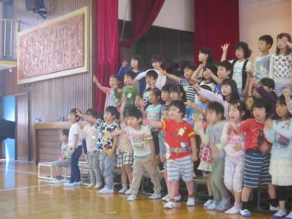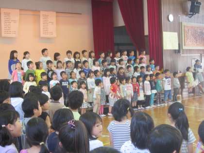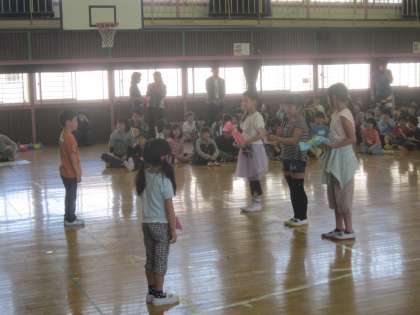 3時間目に全校で1年生を迎える会をしました。1年生が3年生手をつないで入場しました。○×クイズ、ジャンケンゲーム、全校合唱、プレゼントなど、楽しい歓迎の行事になりました。最後は、5・6年生の作った馬に乗って笑顔で退場しました。